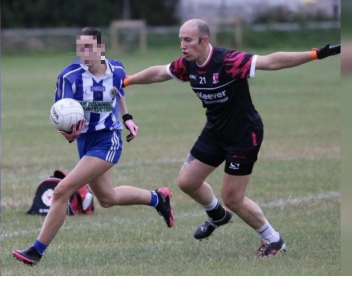 The man above is allowed to play soccer against young women.
